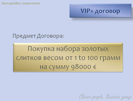 VIP+ договор предусматривает приобретение клиентом набора слитков инвестиционного золота 999,9 пробы на сумму 98000 евро. Клиент может внести полную сумму по договору сразу или участвовать в Бонусной программе.