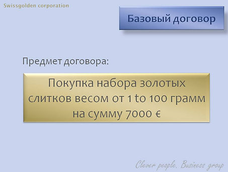 Клиент заключает договор с компанией, согласно условиям которого клиент обязуется приобрести в интернет-магазине Swissgolden набор слитков инвестиционного золота 999,9 пробы весом от 1 до 100 гр. на сумму 7000 евро. Срок выполнения договора не органичен.